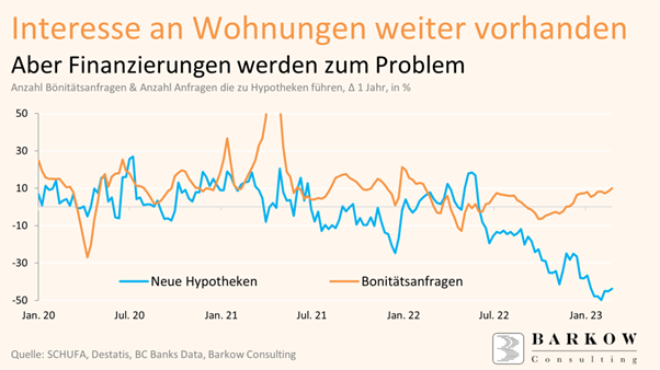 Die Zahlen zeigen demnach ein noch positiveres Bild, denn die Nachfragekurve für Baufinanzierungen steigt seit dem Tief aus Anfang Oktober wieder an und liegt sogar aktuell 10% über dem Vorjahreswert. Dies lässt hoffen, dass der Baufinanzierungs- und Wohnungsmarkt trotz der restriktiveren Kreditvergabe der Banken bald wieder Fahrt aufnimmt.